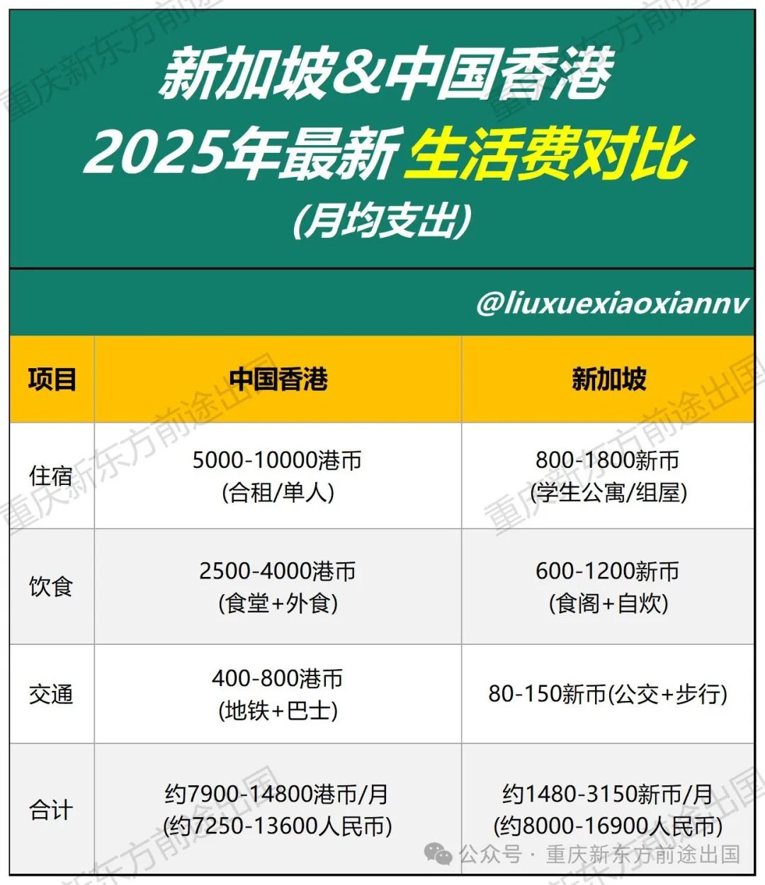 新加坡饮食成本低(食阁均价5-8新币/餐),中国香港外食费用高出30%-50%。