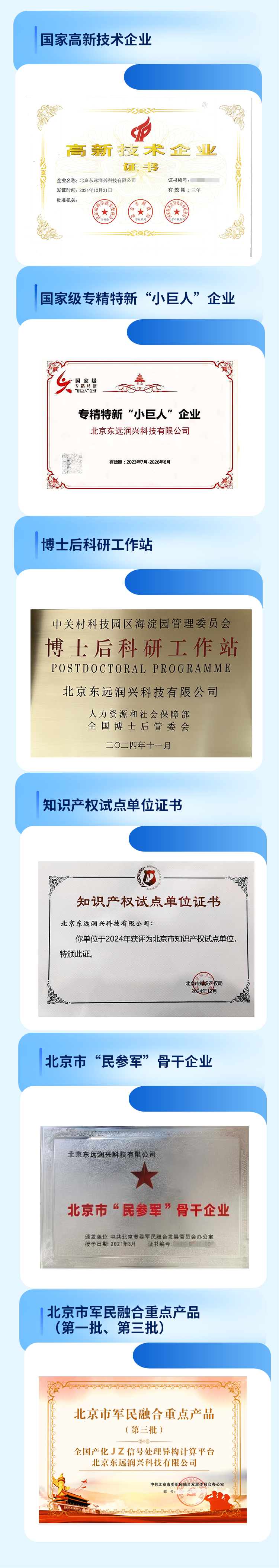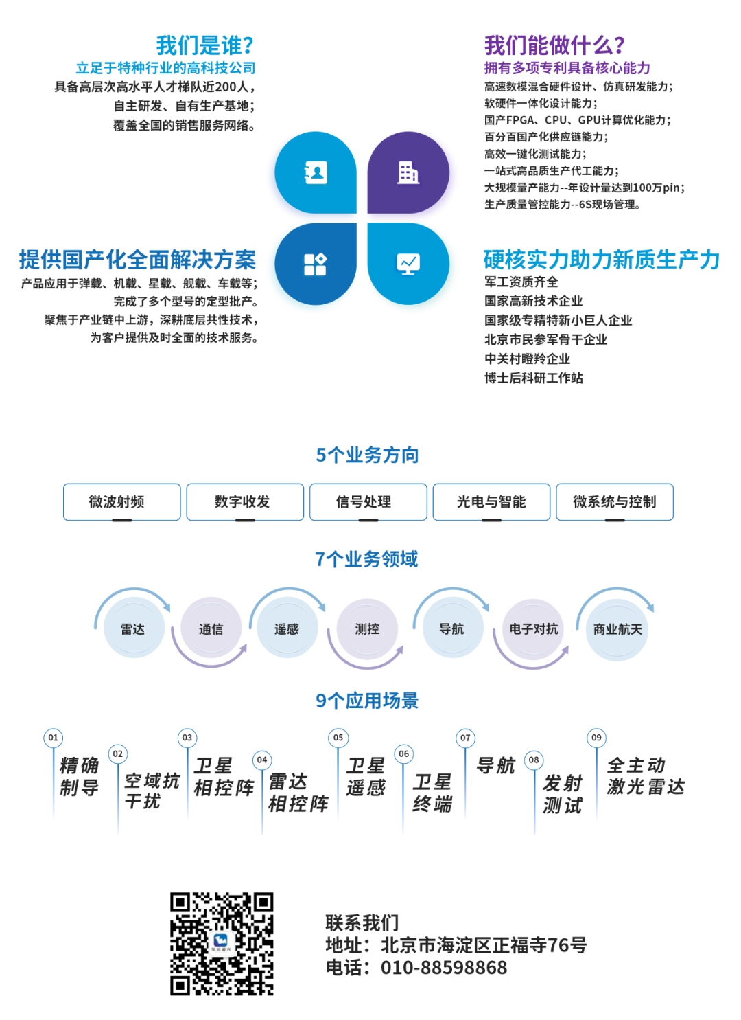 公司军工资质齐全,现已获得“国家专精特新小巨人”、“国家高新技术企业”、“北京市民参军骨干企业”、“中关村瞪羚企业”认定。公司产品已成功应用于多个弹载、机载、星载、舰载、车载、单兵装备中,完成了多个型号装备的定型批产。