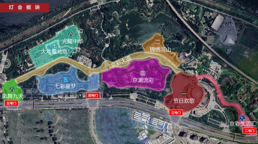 本次“京彩灯会”是京城史上最大规模灯会,也是自贡灯会时隔36年后再度亮相京城。灯会共有节日欢歌、京彩大道、锦绣河山、京潮流彩、七彩童梦、大戏看北京、光耀中华、凤舞九天、京彩生活汇九大主题展区,200余组彩灯,其中大中型彩灯就达到了75组,彩灯挂件共10万件,是一场不可多得的文化与艺术交融的视听盛宴。