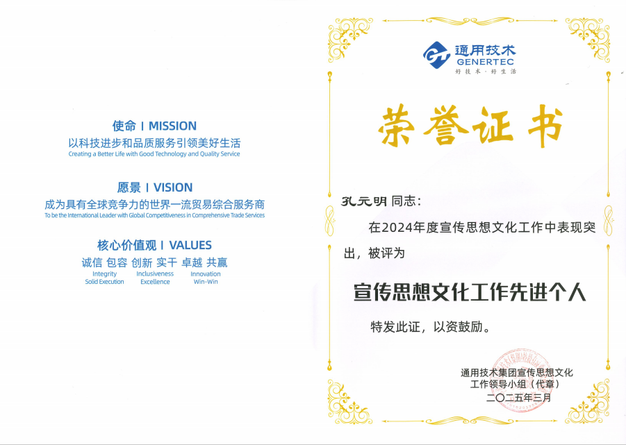 3月27日,通用技术集团2025年宣传思想文化工作会议隆重召开。会议对集团2024年度宣传思想文化工作先进单位、创新案例、优秀作品、先进个人进行了表彰。通用技术中国医药北京公司办公室党务专员孔元明同志荣获集团2024年度“宣传思想文化工作先进个人”称号。