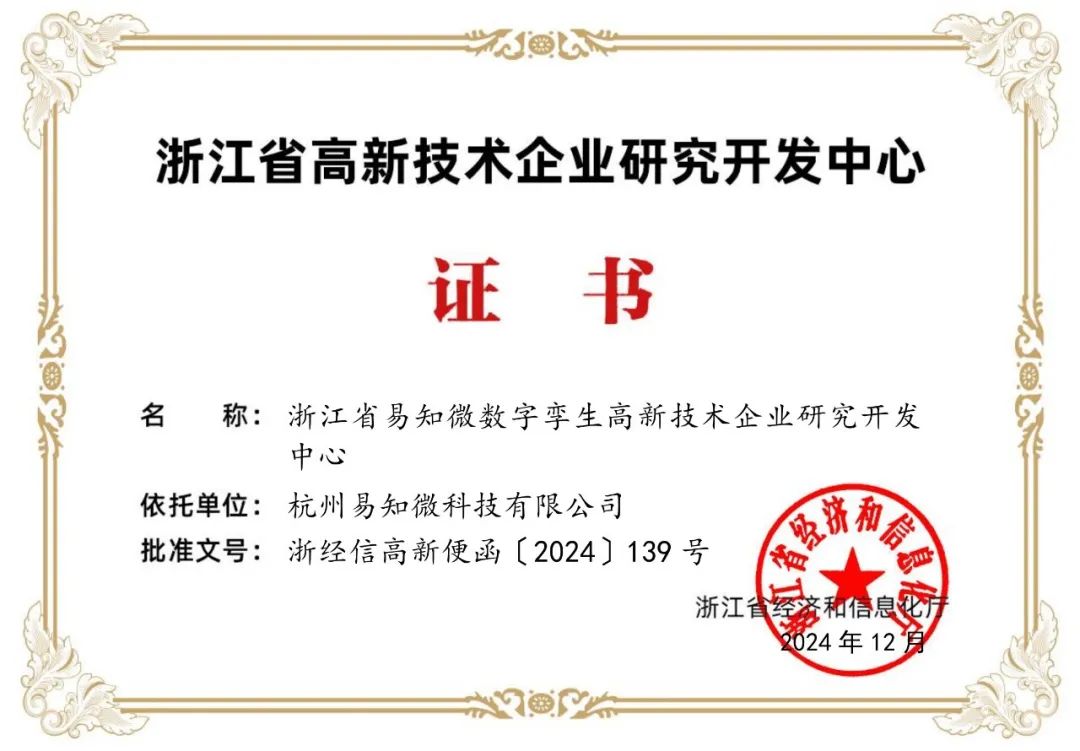 浙江省经济和信息化厅近日公示2024年度拟认定(备案)省级企业研发机构名单。经专家实地考察及综合评审,杭州易知微科技申报的"浙江省易知微数字孪生高新技术企业研究开发中心”被认定为省级高新技术企业研究开发中心。