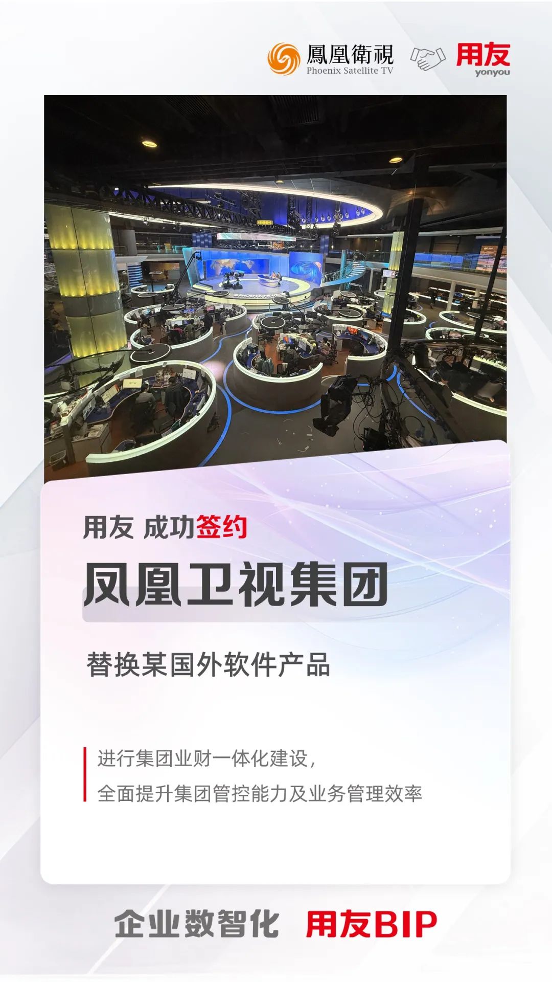 本次合作展现了用友在传媒行业数智化方面的深厚积累和技术实力,也彰显了用友BIP在全球软件市场领先的竞争实力。用友将以凤凰卫视的战略目标和出发,关注媒体行业的业务流程叠代升级能力构建,以数智化手段助力凤凰卫视集团提升整体运营效率和治理能力,走向可持续的高质量发展之路。