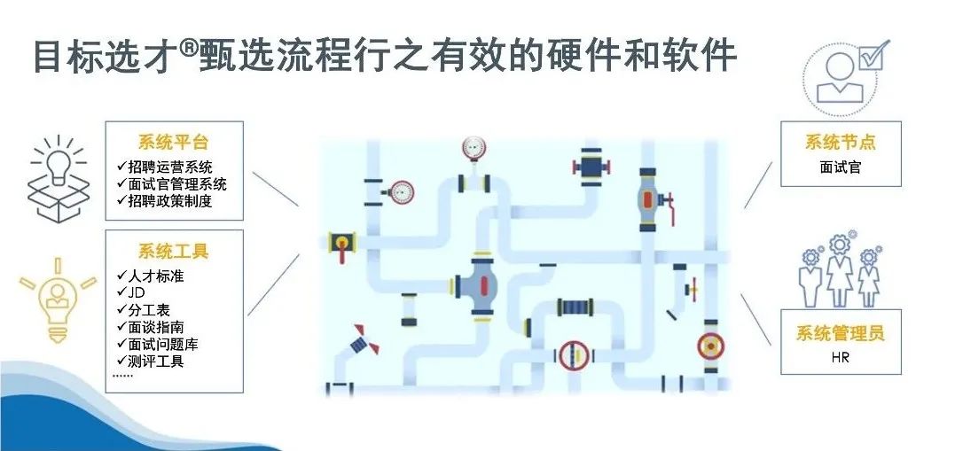 「软件」主要指招聘系统参与者、使用者及他们的能力。相对硬件的显性及刚性,软件常常被忽视。这其中有两类重点人群最需要关注:首先是流程中的节点,即流程中的面试官需要训练有素;二是保证流程运转的管理员,通常是各级组织中负责招聘运营的HR需要掌握管理及维护系统的能力。