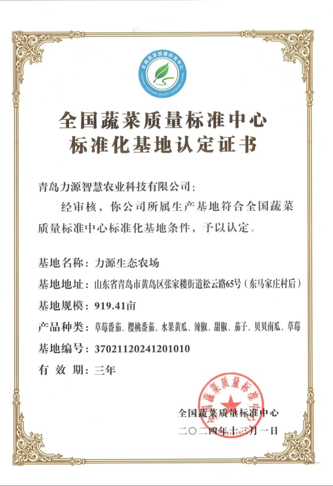 目前,农场已有8大类、15个品种的蔬菜通过绿色认证,获得“中国生态食材生产示范基地”“全国蔬菜质量标准化基地”“青岛市知名农产品企业产品品牌”“青岛市农业标准化生产基地”“青岛市级生态农场”等殊荣。同时,我们积极配合省级、市级等监督抽检、例行抽检、专项抽检,合格率达到 100%。