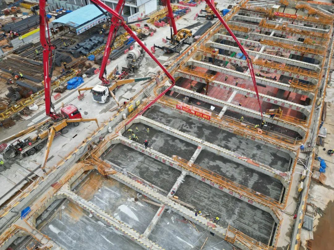 榕城站施工任务重,面临工期紧迫、施工场地狭小、交叉作业、坑内降水井管密集、吊装难度大等多重挑战。为确保车站施工进度,项目部科学策划施工场地布置,精细化施工管理,制定每周施工计划并总结纠偏,动态优化赶工方案,施工高峰期人员投入约300人,实行三班倒24小时不间断作业,为顺利完成车站主体结构提供有力保障。