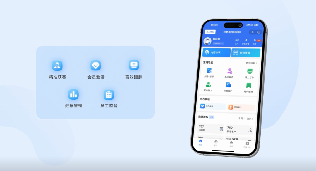 “全域引擎”系统是一款高效匹配嘉宝莉营销链路的数字化工具,包含“产品、服务、内容、数据、社群”的完整闭环。整合抖音、小红书等公域平台的线上流量,与门店私域社群、会员体系深度绑定,形成“内容种草-直播锁客-线下体验-私域复购”的完整链路。为经销商破解流量困局,提升转化效率,强化长效经营,轻松解决传统模式获客难、客户信息留存管理难、订单跟进数据缺失、员工销售行为追踪难等情况,重塑“人、场、货”的关系,满足消费者从认知到复购的全生命周期闭环。