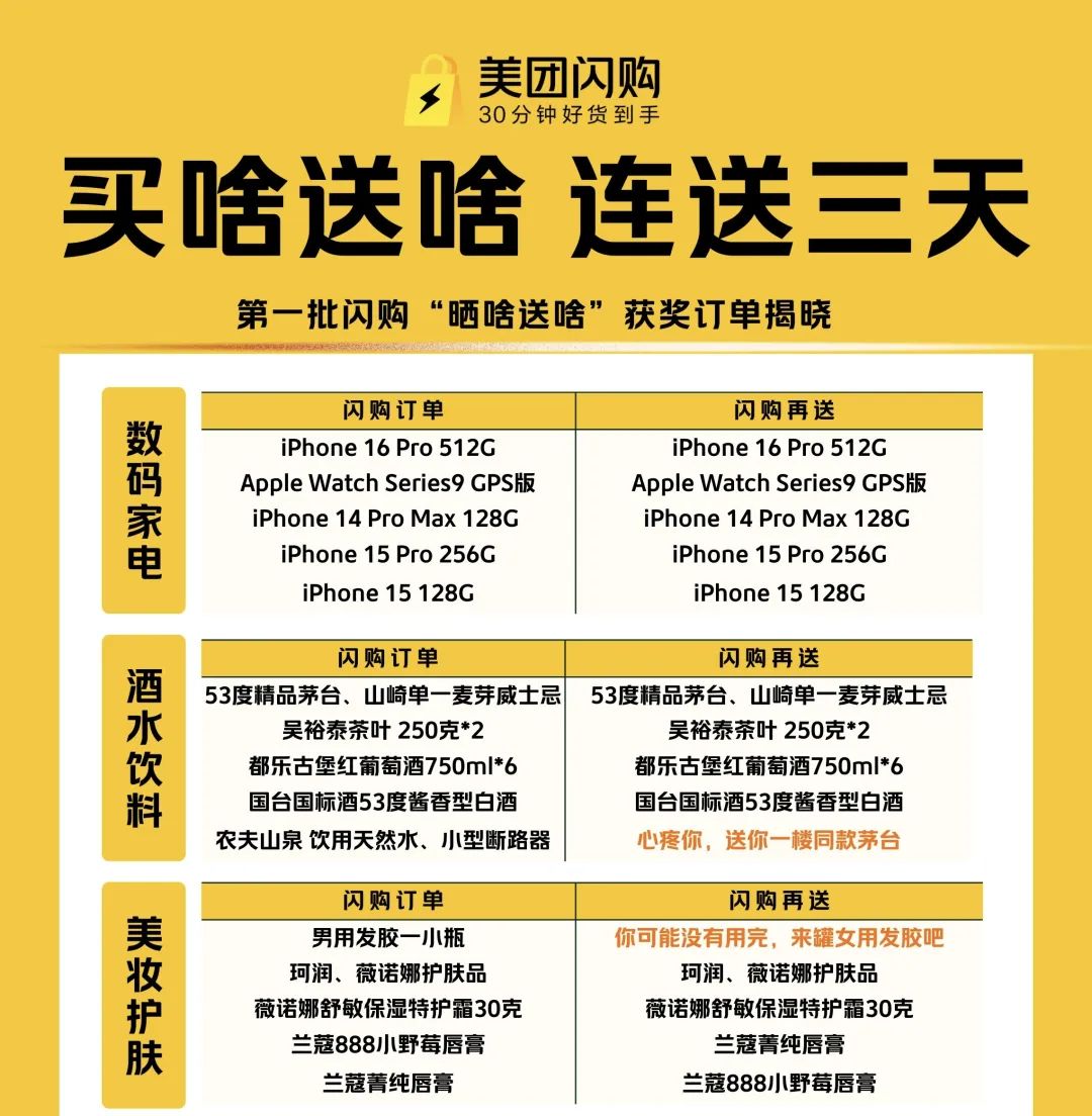 截至4月15日24:00,首批"晒啥送啥"闪购订单开奖榜单正式揭晓——