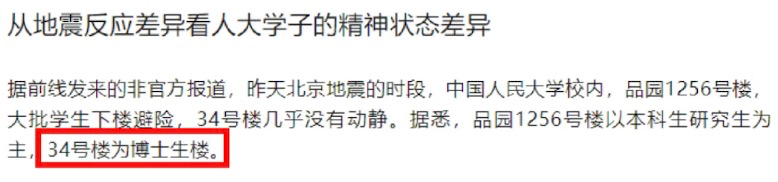 人大校内本科生和硕士生居住的宿舍楼下挤满了下楼避难的学生,博士生宿舍楼几乎毫无动静。
