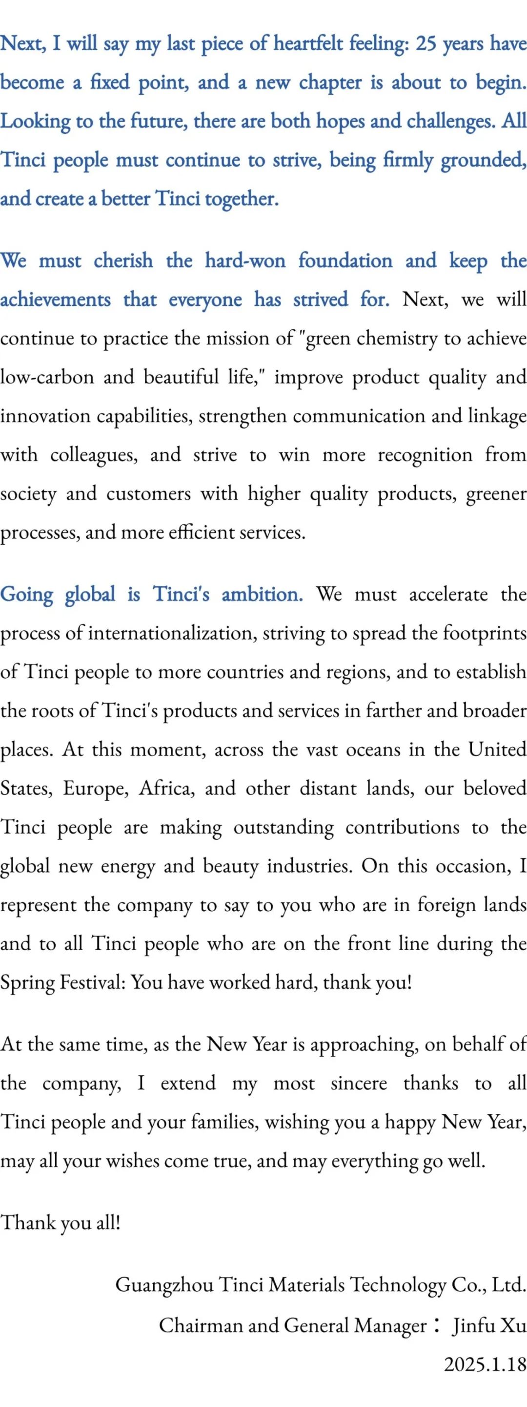 与此同时,在新春即将到来之际,我代表公司向全体天赐人及你们的家人致以最诚挚的感谢,祝大家新年快乐,心想事成,万事如意。