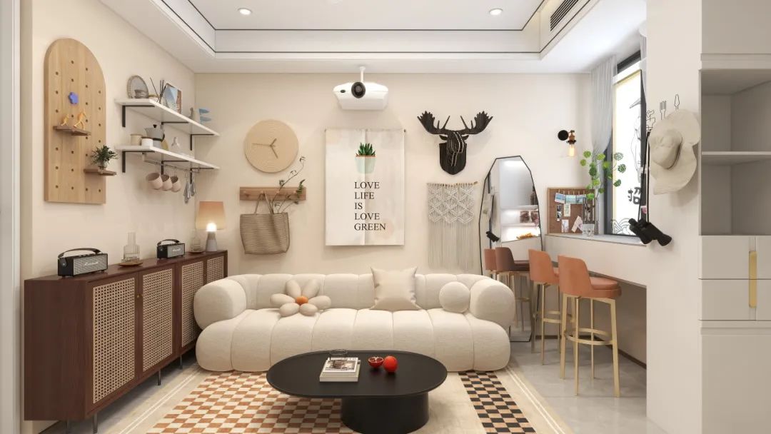 客厅区域以奶白色沙发为主角,搭配复古藤编收纳柜,洞洞板墙面+置物板,承重强,书籍/香薰挂画/绿植/工具随心换,解决收纳不足的问题。