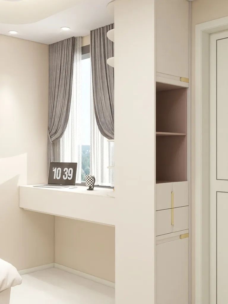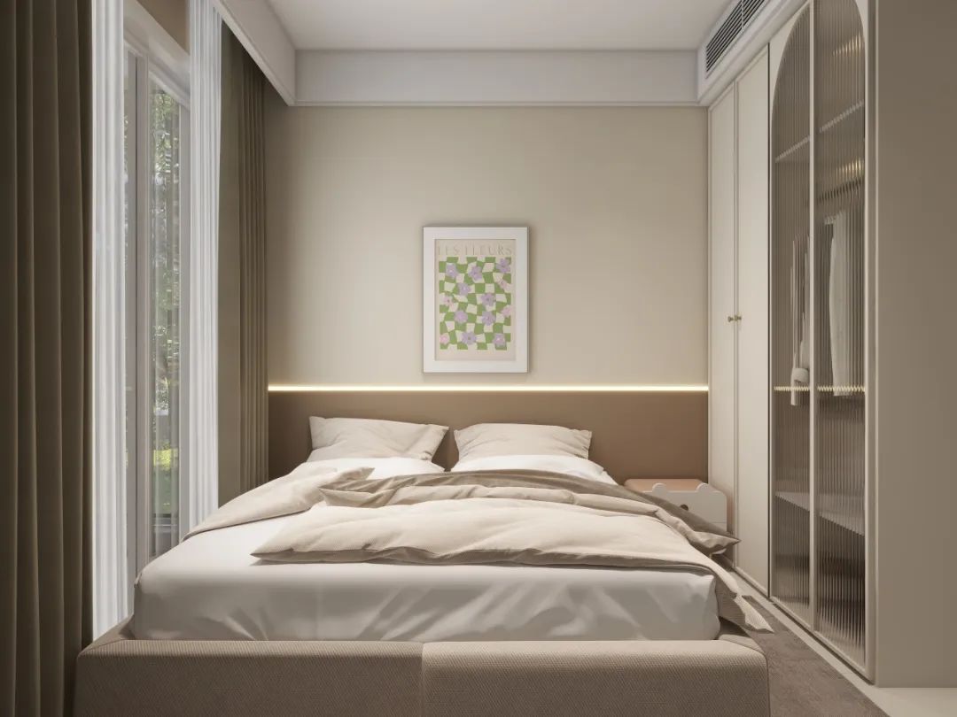 次卧空间紧凑,设计师通过奶咖色系窗帘与玻璃门衣柜的组合,既保证了遮光效果,又增强了空间通透感。