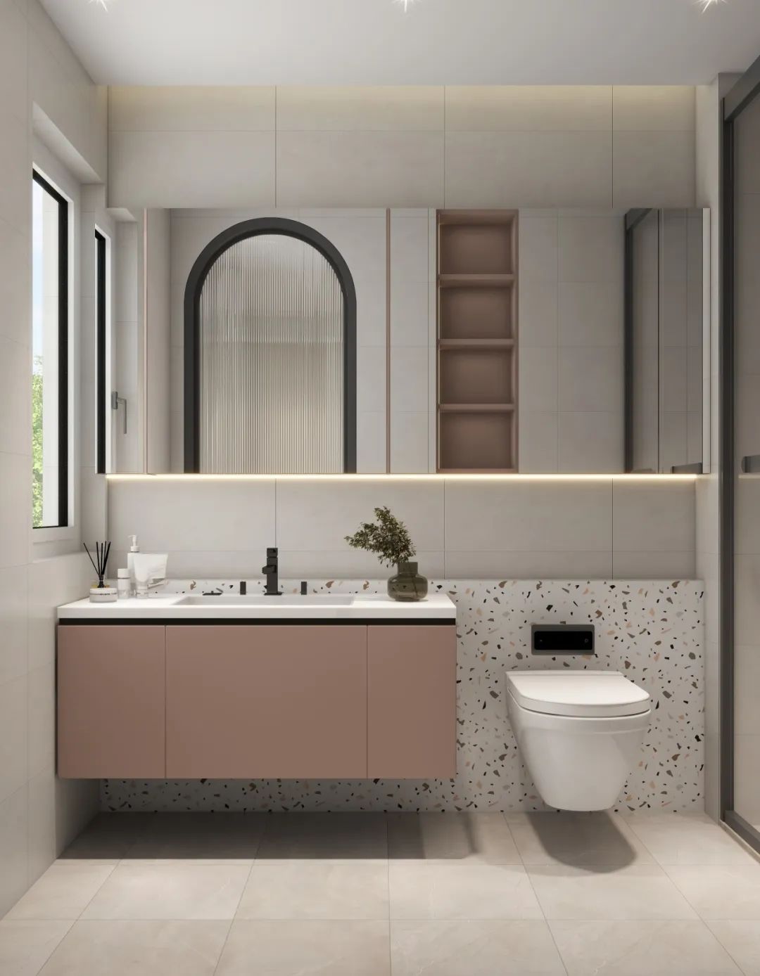 卫生间采用壁挂马桶设计,节省空间的同时便于清洁。墙面铺贴马赛克瓷砖,中部镂空打造壁龛,增加收纳功能,既实用又美观。