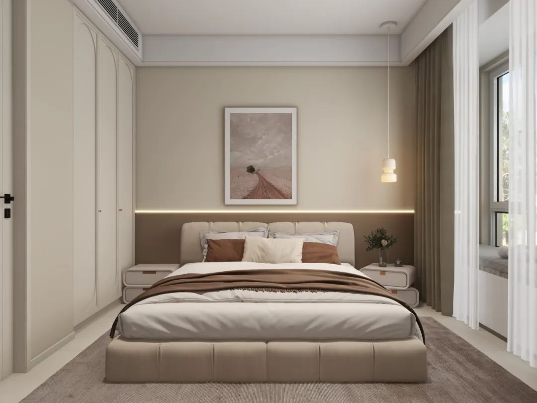 主卧以奶油风为基调,床头采用半墙木饰面设计,搭配隐藏灯带与吊灯,起夜不刺眼,营造出温馨的睡眠氛围。