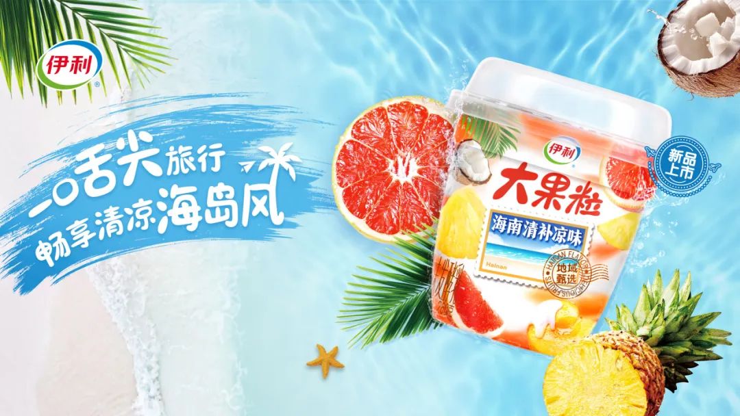 伊利大果粒打造“地域美味乳品化”研发路径,选用100%生乳奶源,搭配6种果料,果量添加达15%,真正实现“一口舌尖旅行,畅享清凉海岛风”,让消费者在品尝酸奶的同时,仿佛置身于海南的美丽风光之中。