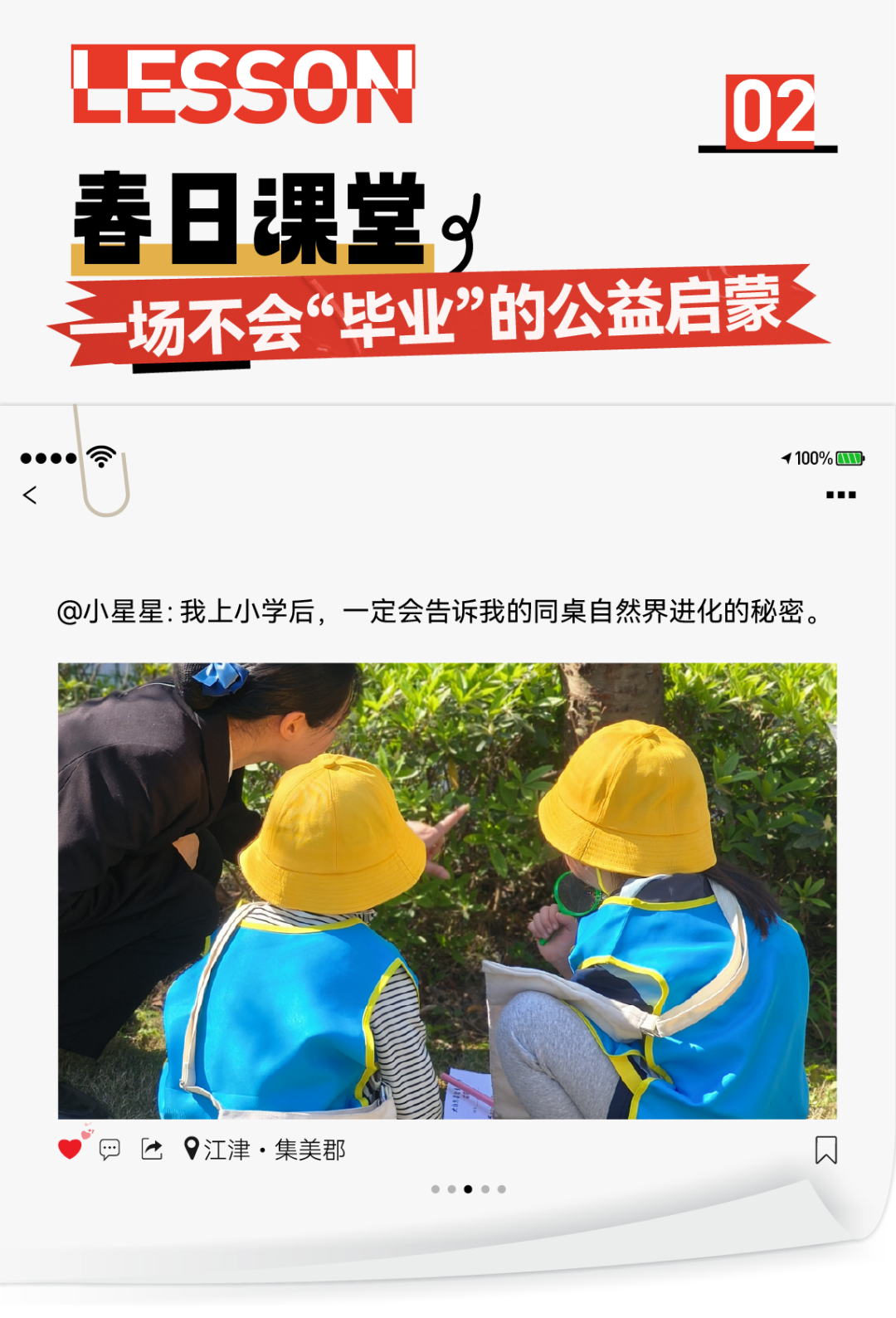 江津集美郡大社区志愿者连续3年联合李子湖幼儿园,以“垃圾分类科普→动植物观察→生物界探索”进阶的春日课堂,贯穿在小朋友们3年的学前时光里,为小志愿者们播撒环保火种。