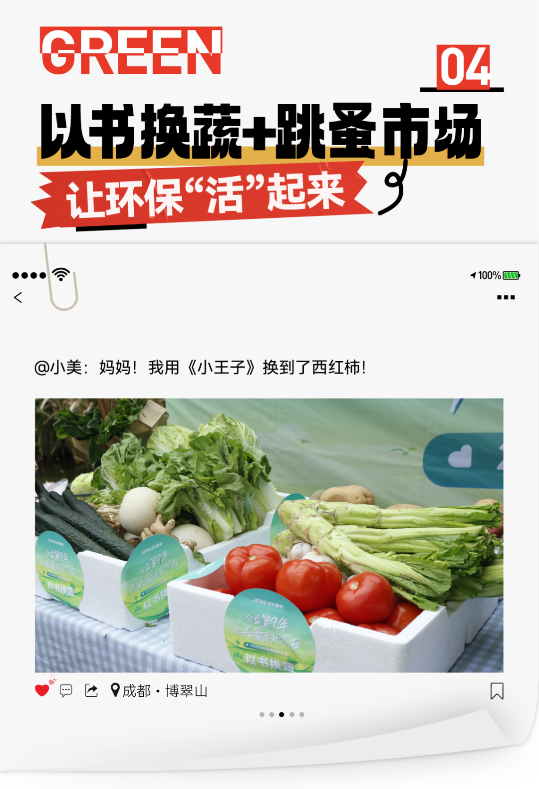 同时,跳蚤市场上,8岁的朵朵正认真向邻居讲解她手绘的环保布袋:"叔叔,这个可以反复用100次哦!"这一场以书换蔬+跳蚤市场的公益活动,让那些曾经蒙尘的旧物在交换中重新发光;也让小小志愿者们通过“一日公益摊主”的角色,深深理解公益的意义。
