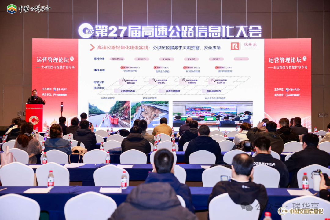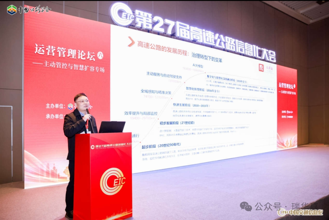 28日上午10时,解决方案销售部部长熊君紧扣大会”数智·转型·安全“主题,结合瑞华赢实践经验,以“治理转型背景下的智慧公路轻量化建设实践”为主题进行主旨汇报。汇报首先回顾了中国高速从基础设施建设到AI技术引入,从信息化到智慧化的发展历程,点明“高速转型”是时代发展的要求。面对如今“交通安全保障、交通拥堵缓解、服务水平提升、运营成本降低”等痛点需求,提出“轻量化”解决思路,即通过优化原有机电系统,仅在重点路段新建、加密智能化感知设备,可以减少企业成本投入,同时实现对高速公路的有效治理。