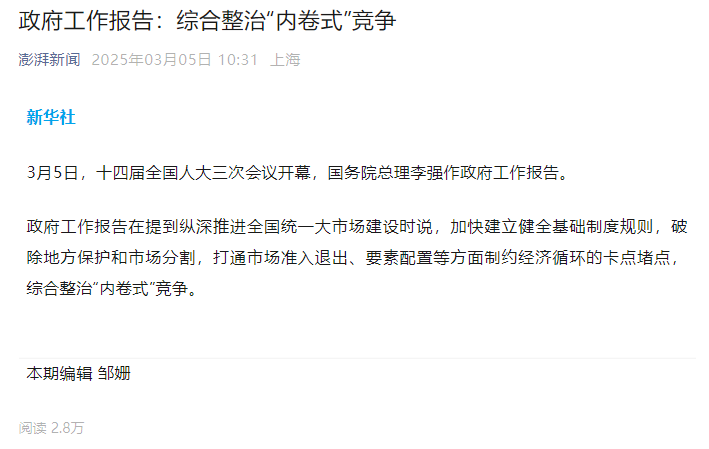 但中央一句话,撕开了内卷的真相:综合整治“内卷式”竞争,规范政府和企业行为。
