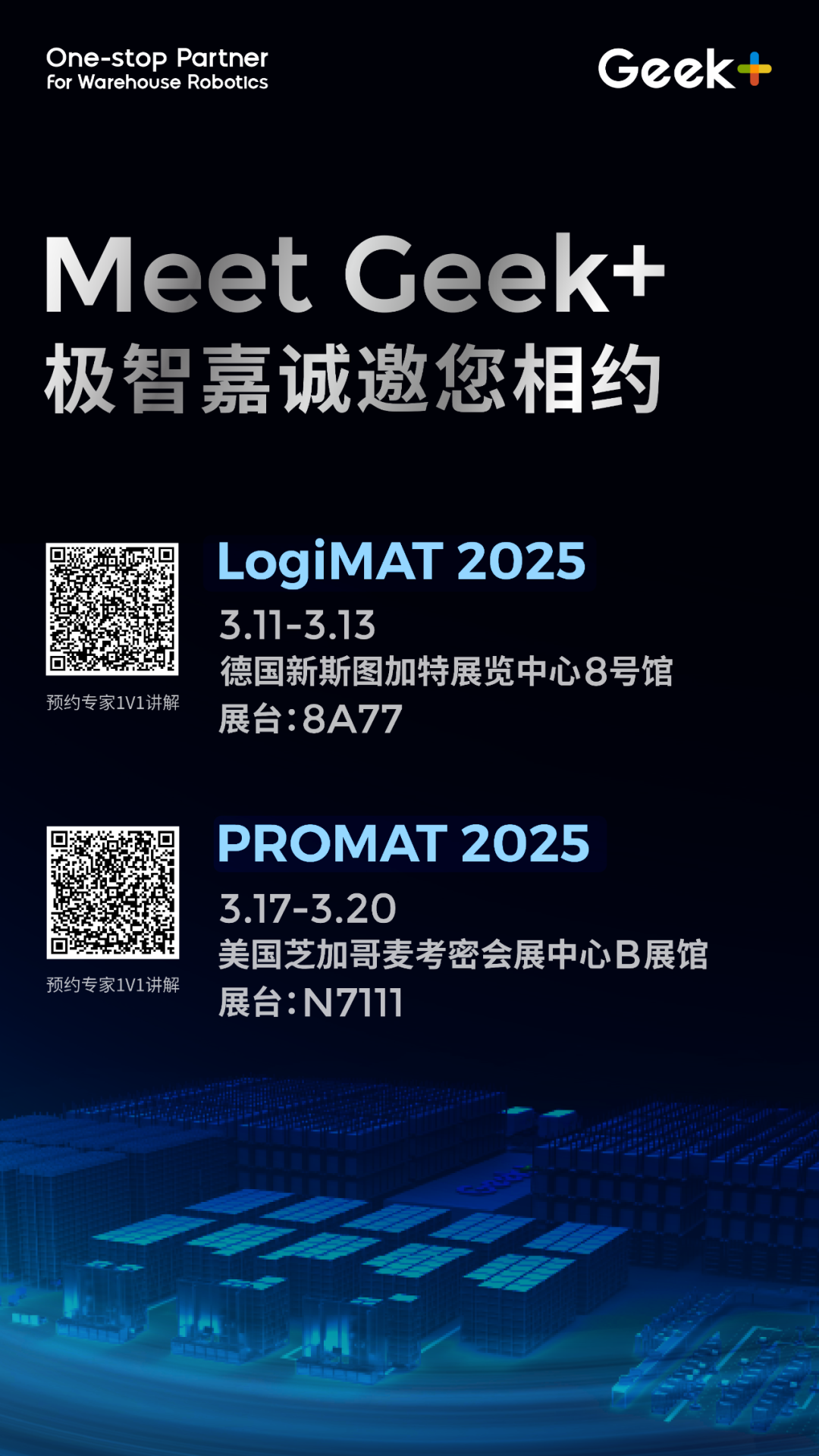 2025年,全球物流行业的两大顶级盛会——德国LogiMAT与美国PROMAT开展在即,全球仓储机器人引领者极智嘉(Geek+)蓄势待发,将携旗下新一代解决方案闪亮登场,全方位展示在智能仓储领域的最新突破!