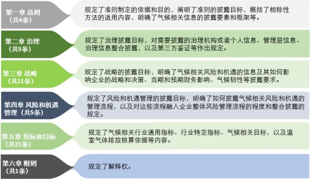 根据气候准则征求意见稿第四条,为满足气候相关信息基本使用者的信息需求,企业应当按照准则第二章至第五章的要求(即,围绕治理、战略、风险和机遇管理、指标和目标),披露重要的气候相关风险和机遇的信息。为满足信息使用者对气候相关信息的需求,企业还应当披露上述未涵盖的重要的气候相关影响信息。企业披露的气候相关影响信息不应掩盖或者模糊其披露的气候相关风险和机遇信息。