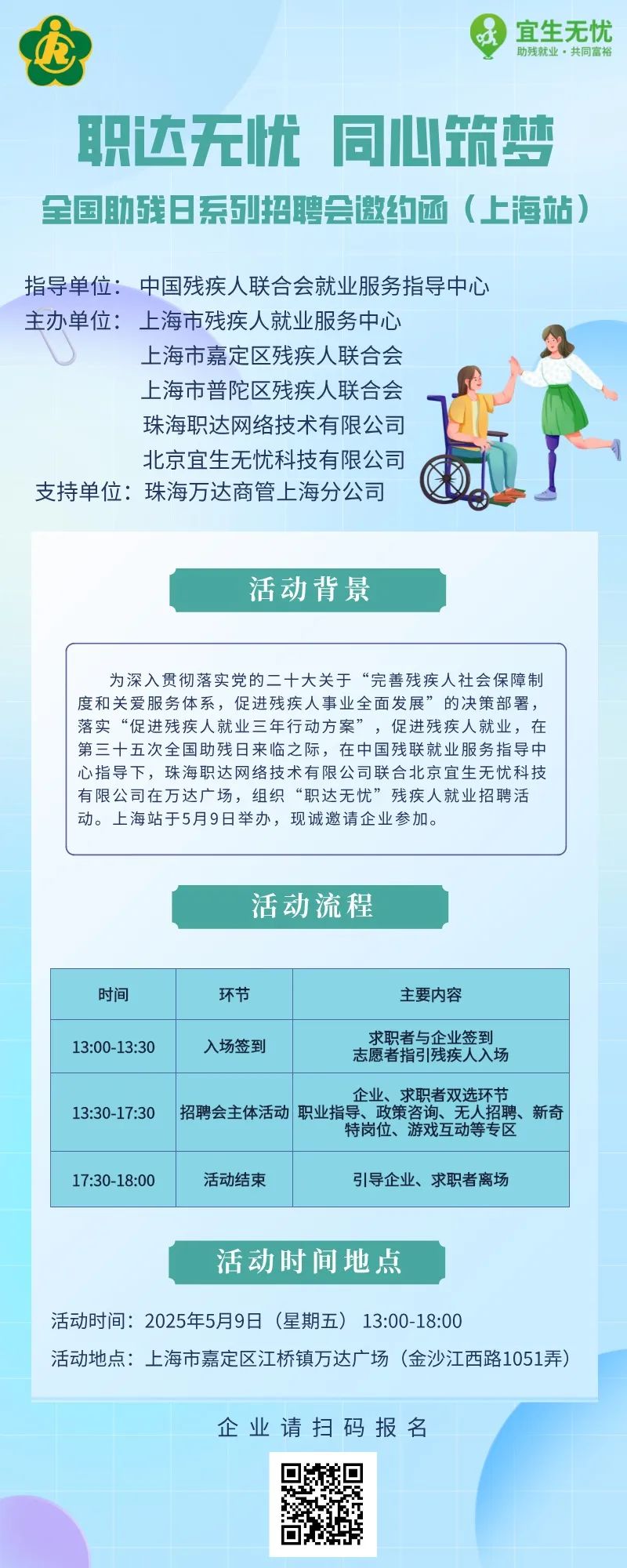 在中国残疾人联合会就业服务指导中心的指导下,珠海职达网络技术有限公司与北京宜生无忧科技有限公司携手,将于上海市嘉定区江桥镇万达广场举办“职达无忧 同心筑梦”残疾人就业专场招聘会。
