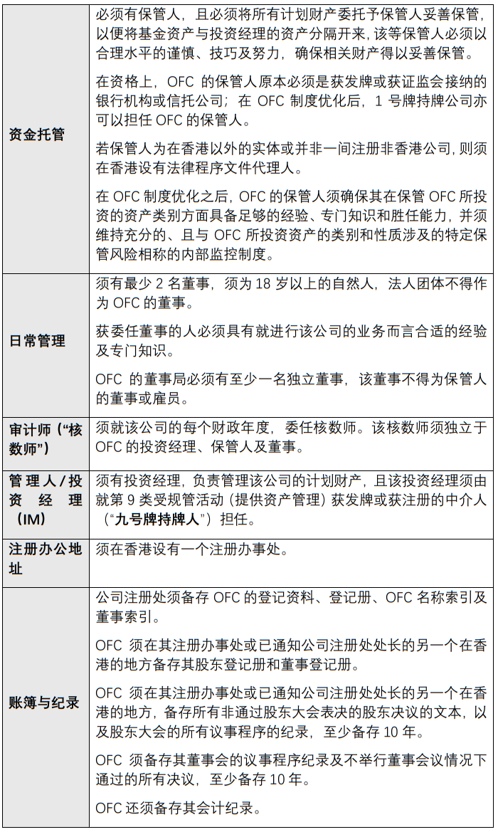 旧的《开放式基金型公司守则》对私募OFC的限制原本为最少90%的资产总值须包含 (1)其管理会构成第9类受规管活动的资产类别(包括但不限于各类证券),及/或 (2) 现金、银行存款、存款证、外币及外汇交易合约。但是,为推动更多私募基金在香港以OFC的形式设立,香港证监会优化了OFC制度,彻底取消《开放式基金型公司守则》对私募OFC的投资限制。自新的《开放式基金型公司守则》于2020年9月发布后,私募OFC已不受任何投资限制,只是要求确保OFC要约文件内清晰地披露因开放式基金型公司所投资资产的类别和性质而涉及其所特有的所有重大风险,特别是当开放式基金型公司将其10%或以上的资产总值投资于非金融或其他较为少见的资产类别时。