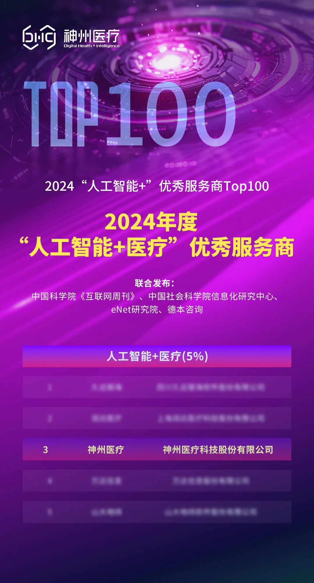 在新一轮科技革命和产业变革的浪潮中,人工智能正成为推动医疗健康行业转型的重要力量。近日,中国科学院《互联网周刊》、中国社会科学院信息化研究中心、eNet研究院、德本咨询联合发布了“2024‘人工智能+’优秀服务商Top100”榜单,其中“‘人工智能+医疗’优秀服务商”共有5个席位,神州医疗以其在医疗大数据与人工智能领域的突出贡献和卓越成就,荣登“2024年度‘人工智能+医疗’优秀服务商”榜单。