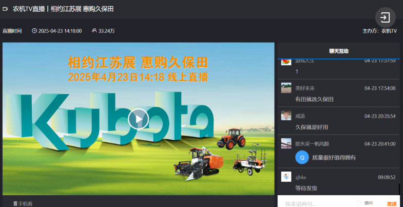 2025年4月23日,第十三届江苏国际农业机械展览会在江苏南京隆重开展。卓众出版“农机TV”携手久保田农业机械(苏州)有限公司(以下简称久保田公司)在展会现场开启线上直播。本次直播共吸引观看人次超33万,订单金额超3500万元,再创佳绩。