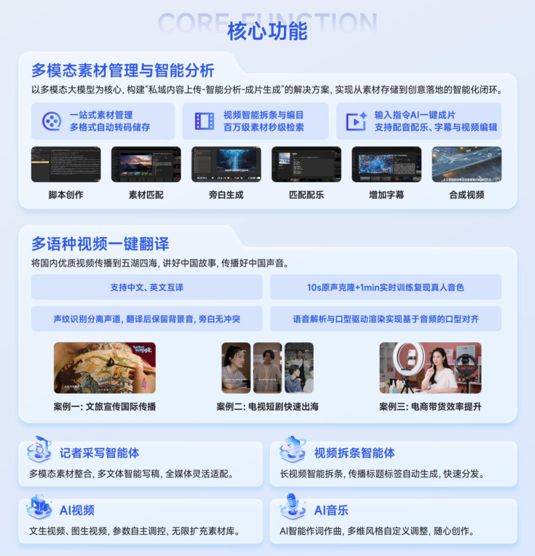 平台具备强大的多模态内容智能理解、生成、审核、拆条和编目能力,提供覆盖视频内容创作全链条的AI工具30余种,内置素材一键成片、长视频智能拆分、视频翻译、图文速编等智能体,满足多元业务需求,将专业化视频内容创作的成本降低 80%以上。