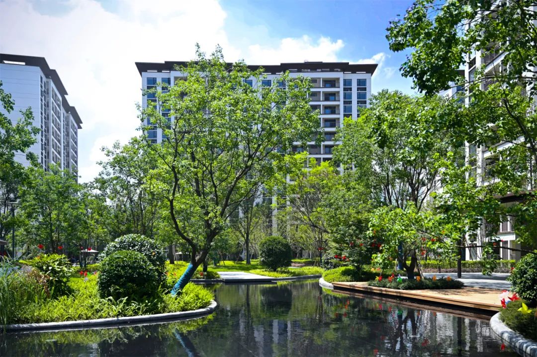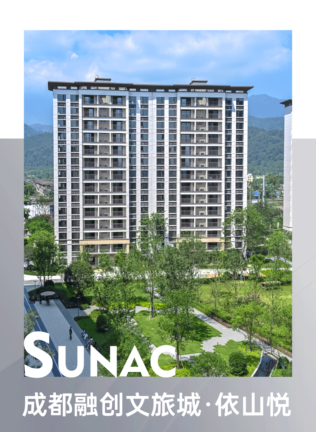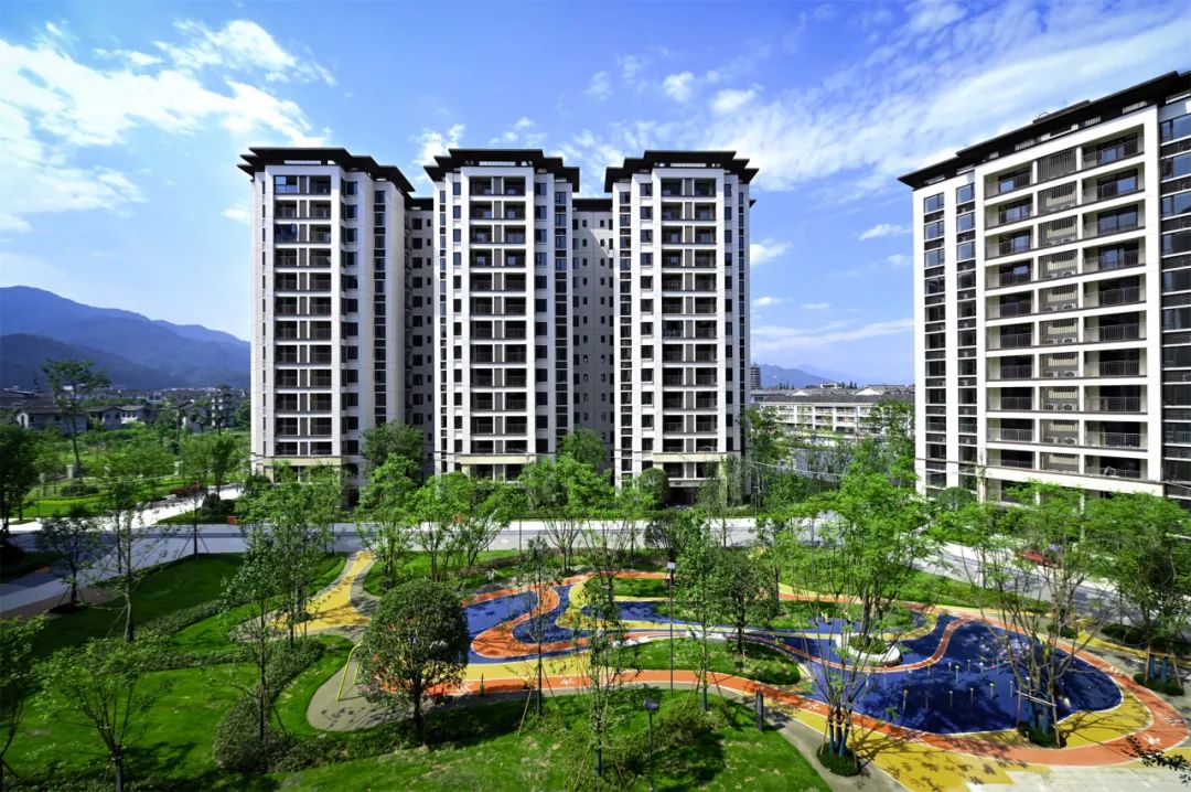 8月19日,成都融创文旅城·依山悦盛大交付,为1409户业主呈现幸福家境。历经时光的酝酿,关于家的美好期许,在这一刻得到了美好回应。背靠赵公山、玉垒山,西依沙沟河,南邻融创茂、融创乐园,北面,是玉堂小学及金苹果幼稚园。依山悦融自然生态于繁华城市,汲取自然的智慧,打造府园森居,为千年都江堰再添一座温暖的旅居栖居地。为了让业主享受最好的旅居体验,依山悦承袭了成都融创文旅城住宅“显山露水,高低错落,活力宜居”的整体规划策略。社区由洋房和小高层组成,各自独立成区;西侧洋房沿河带状布局,构筑亲水低密水岸生活;小高层采取围合式布局,建筑群连缀成环,把两大中心庭院的绿色包裹成块。两个组团高低分区,形成丰富的天际线变化,让居者可以最大限度体验都江堰市山水宜居的魅力;同时,疏阔的楼间距,塑造出大尺度庭院空间,创造不一样的休闲度假型居住方式。走进依山悦,抬眼望去,建筑在蓝天白云的映衬中,呈现出流动的美感与韵律。立面采用经典三段式设计,传统与现代相结合,展现出典雅的东方韵味。主墙面采用蓝灰色low-E玻璃、米色面砖,局部运用深咖色面砖,结合铝板、金属格栅,以及住宅入户门头的石材等,以色彩的对撞、材料的质感融合,凸显沉稳、大方而富有生机的建筑特质。在依山悦,园区景观在规划之初便充分浸入城市肌理,以沉浸式森林水岸生活为主题构建景观体系和多重生活场景,打造自然素雅的生活氛围,解锁住户对理想社区的畅想。沿着酒店式主入口步入,在入园与入户之间,依次布置迎宾水院、林下休闲客厅、全天候廊架等生动场景,形成元气归家动线,以多重归家场景体验,铺陈出层次丰富的“微度假”之旅。