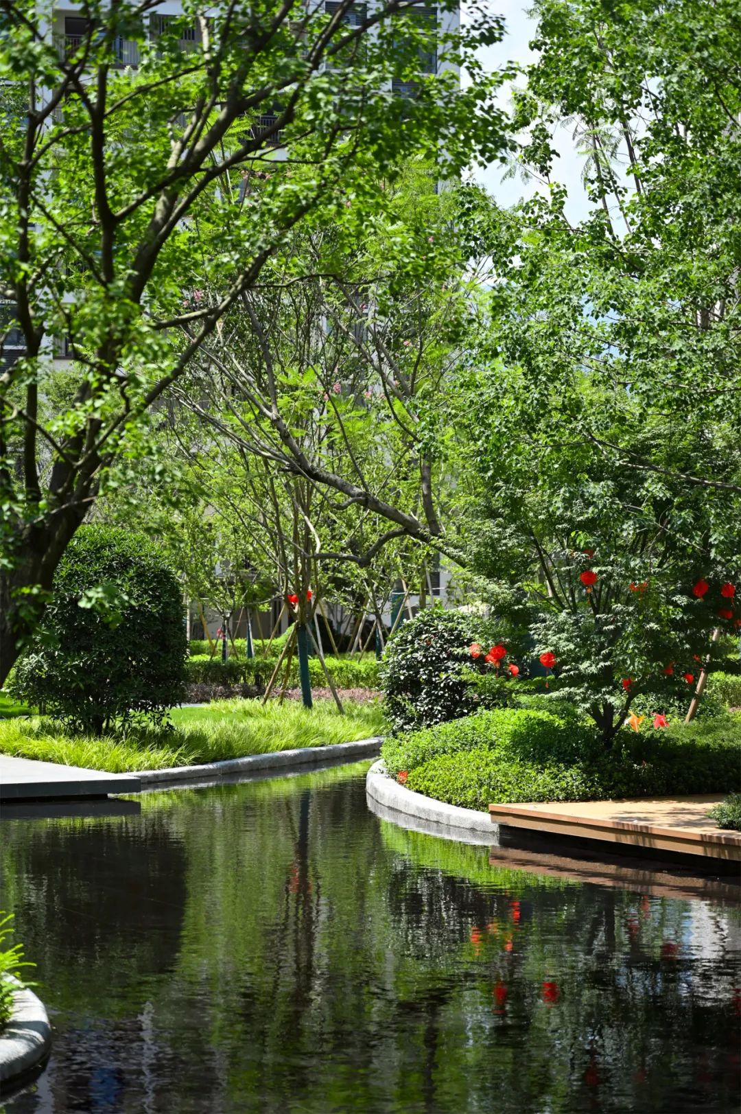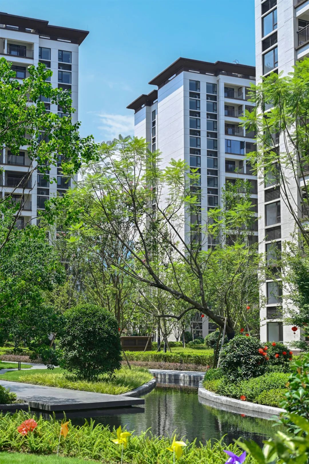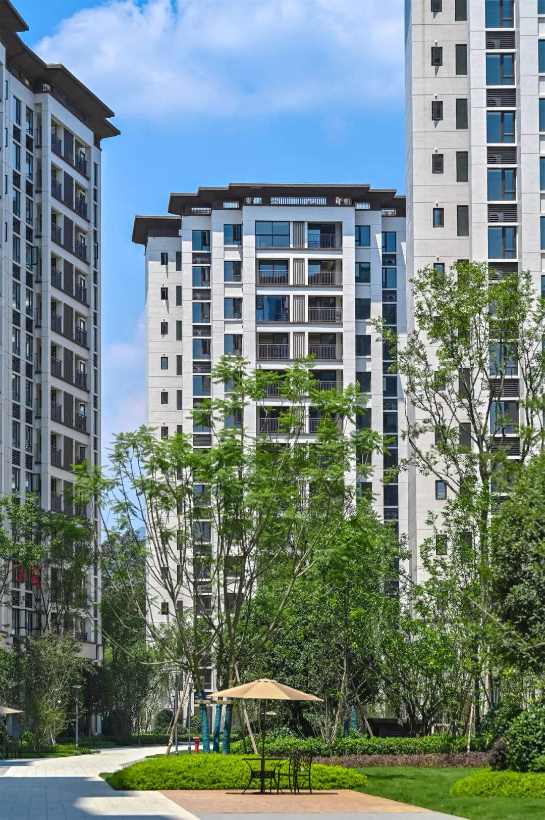 8月19日,成都融创文旅城·依山悦盛大交付,为1409户业主呈现幸福家境。历经时光的酝酿,关于家的美好期许,在这一刻得到了美好回应。背靠赵公山、玉垒山,西依沙沟河,南邻融创茂、融创乐园,北面,是玉堂小学及金苹果幼稚园。依山悦融自然生态于繁华城市,汲取自然的智慧,打造府园森居,为千年都江堰再添一座温暖的旅居栖居地。为了让业主享受最好的旅居体验,依山悦承袭了成都融创文旅城住宅“显山露水,高低错落,活力宜居”的整体规划策略。社区由洋房和小高层组成,各自独立成区;西侧洋房沿河带状布局,构筑亲水低密水岸生活;小高层采取围合式布局,建筑群连缀成环,把两大中心庭院的绿色包裹成块。两个组团高低分区,形成丰富的天际线变化,让居者可以最大限度体验都江堰市山水宜居的魅力;同时,疏阔的楼间距,塑造出大尺度庭院空间,创造不一样的休闲度假型居住方式。走进依山悦,抬眼望去,建筑在蓝天白云的映衬中,呈现出流动的美感与韵律。立面采用经典三段式设计,传统与现代相结合,展现出典雅的东方韵味。主墙面采用蓝灰色low-E玻璃、米色面砖,局部运用深咖色面砖,结合铝板、金属格栅,以及住宅入户门头的石材等,以色彩的对撞、材料的质感融合,凸显沉稳、大方而富有生机的建筑特质。在依山悦,园区景观在规划之初便充分浸入城市肌理,以沉浸式森林水岸生活为主题构建景观体系和多重生活场景,打造自然素雅的生活氛围,解锁住户对理想社区的畅想。沿着酒店式主入口步入,在入园与入户之间,依次布置迎宾水院、林下休闲客厅、全天候廊架等生动场景,形成元气归家动线,以多重归家场景体验,铺陈出层次丰富的“微度假”之旅。