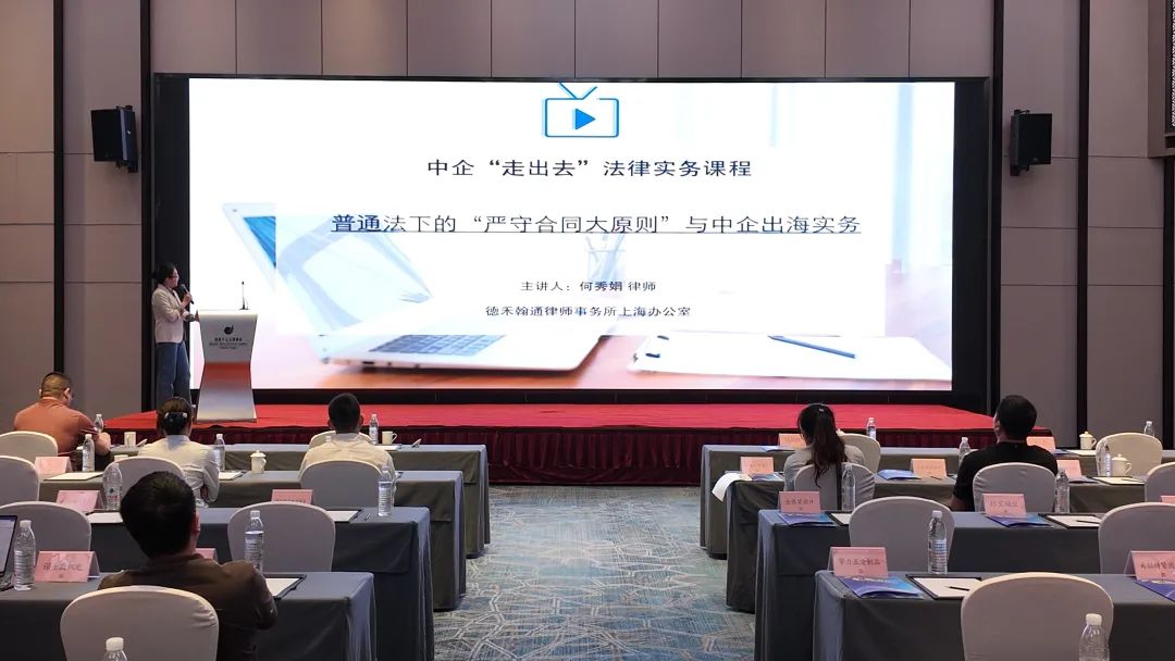 主题宣讲环节,德禾翰通上海办公室高级合伙人、德禾上海涉外业务委员会主任何秀娟律师作“普通法下的严守合同大原则与中企出海实务”主题分享。她围绕“严守合同原则的解释、跨境交易中与严守合同原则相关的实务雷区”两大要点展开深入阐述。何秀娟律师以其丰富的实务经验,为中企出海规避合同风险提供了极具价值的参考与指引。