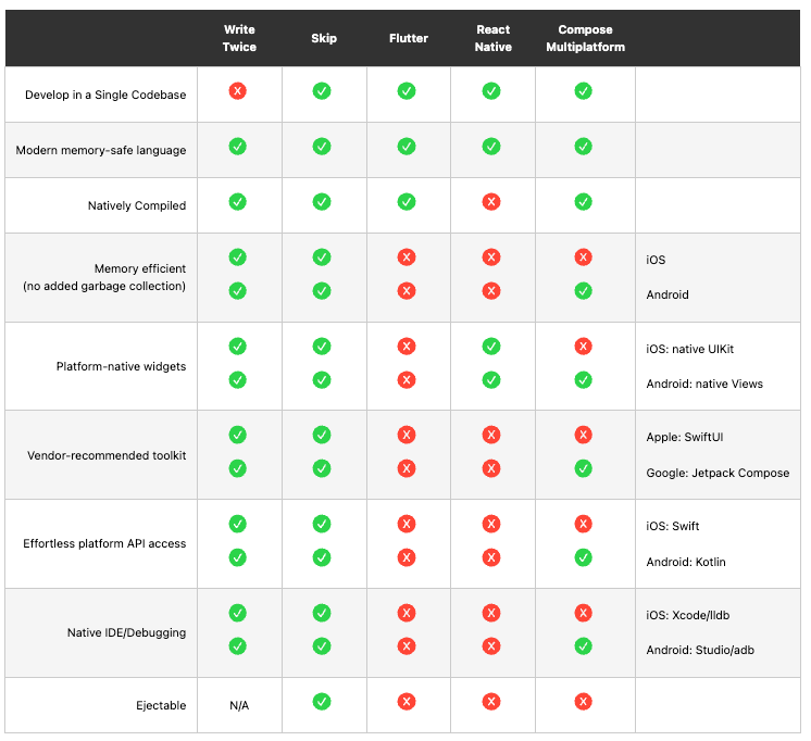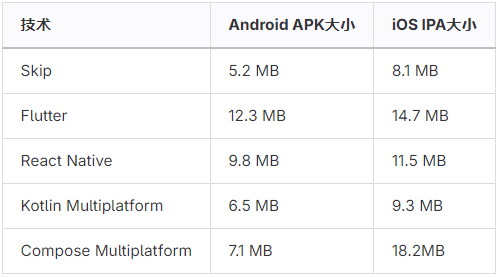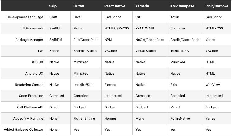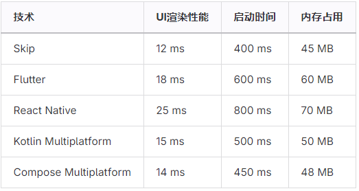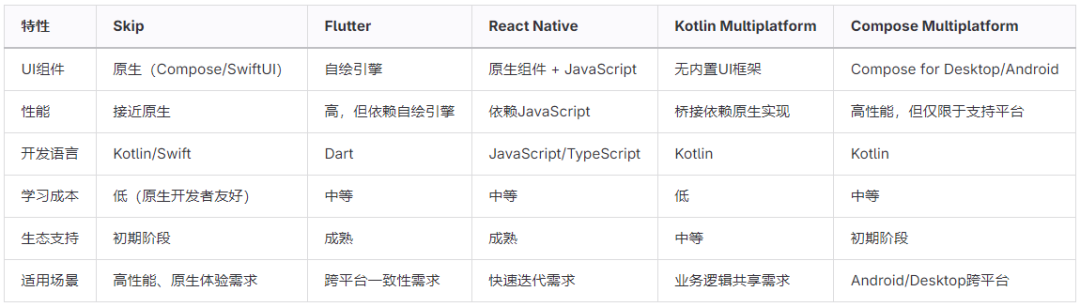 Skip与Flutter、React Native、Kotlin Multiplatform和Compose Multiplatform的详细对比: