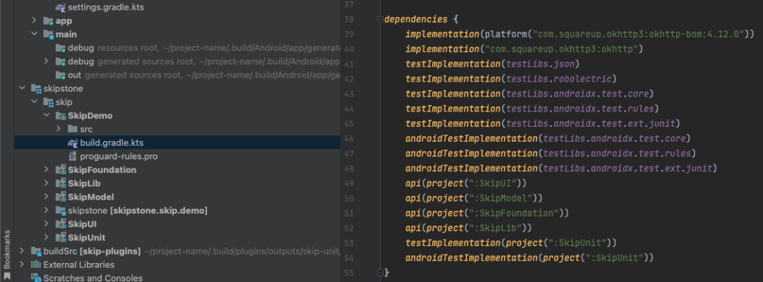 Xcode对SkipDemo工程编译生成的Android源码和依赖都在skipstone文件夹下,开发人员编写的代码转译产物在SkipDemo中,其依赖项和其同级,此代码可以单独用AS直接打开运行。具体如下: