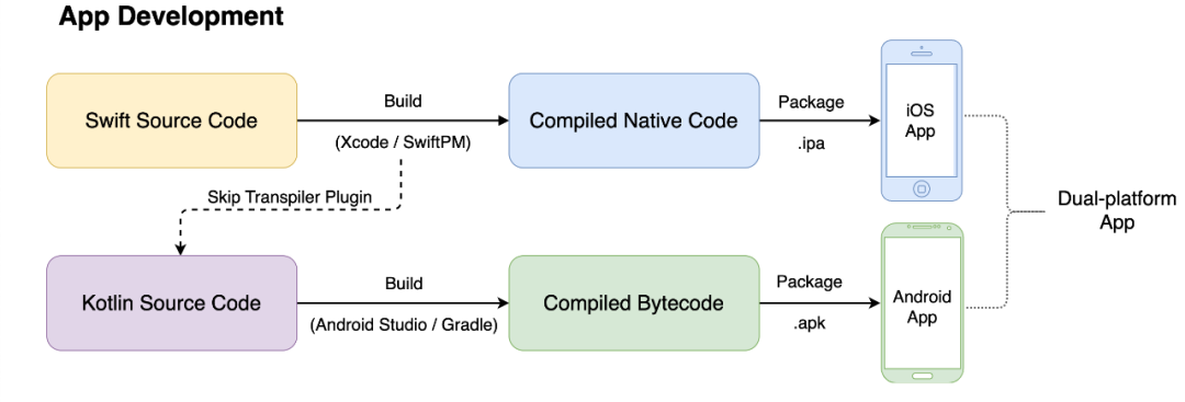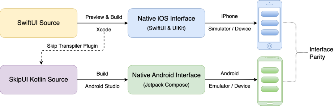 与Flutter和React Native不同,Skip不依赖于自绘引擎或JavaScript桥接,也不同于Kotlin Multiplatform将Kotlin代码编译成各个平台的目标代码。Skip的工作原理基于现代编程语言的相似性,通过将Swift和SwiftUI的代码转换为Kotlin和Jetpack Compose的代码,实现跨平台代码共享。