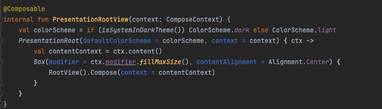 open class MainActivity: AppCompatActivity {constructor() {}override fun onCreate(savedInstanceState: android.os.Bundle?) {super.onCreate(savedInstanceState)logger.info("starting activity")UIApplication.launch(this)enableEdgeToEdge()setContent {val saveableStateHolder = rememberSaveableStateHolder()saveableStateHolder.SaveableStateProvider(true) {PresentationRootView(ComposeContext())SideEffect { saveableStateHolder.removeState(true) }}}}}@Composableinternal fun PresentationRootView(context: ComposeContext) {val colorScheme = if (isSystemInDarkTheme()) ColorScheme.dark else ColorScheme.lightPresentationRoot(defaultColorScheme = colorScheme, context = context) { ctx ->val contentContext = ctx.content()Box(modifier = ctx.modifier.fillMaxSize(), contentAlignment = Alignment.Center) {RootView().Compose(context = contentContext)}}}