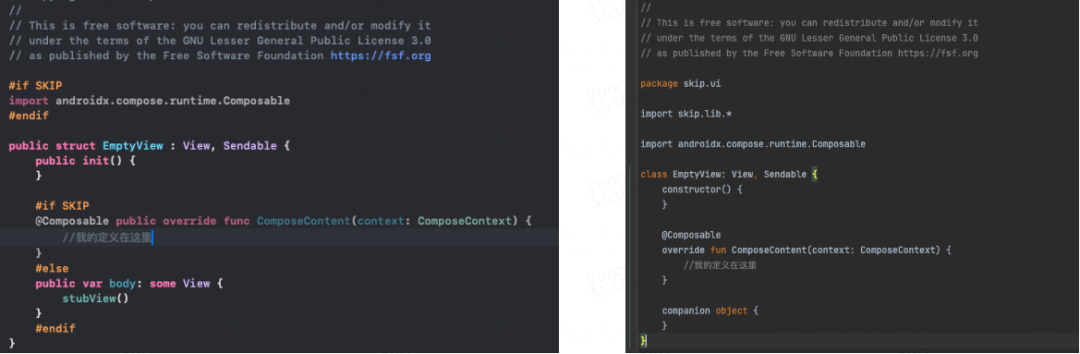 转换器通过SKIP的宏定义,通过判断此宏定义来分离Kotlin还是Swift。SKIP包围的是Kotlin的代码,非SKIP的就是专属Swift的代码,同时有些关键字的替换,如Swift的构造方法init在转换后的代码中就是constructor等。具体如下: