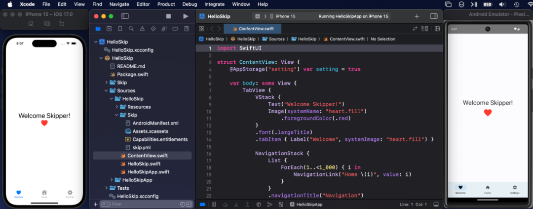 Skip基于Swift语言生成Kotlin和Jetpack Compose的代码产物,因此调试沿用iOS和Android的开发工具,即Xcode和Android Studio。这相较于其他跨端框架对移动端原生开发者非常友好,尤其对于KMP的开发者。