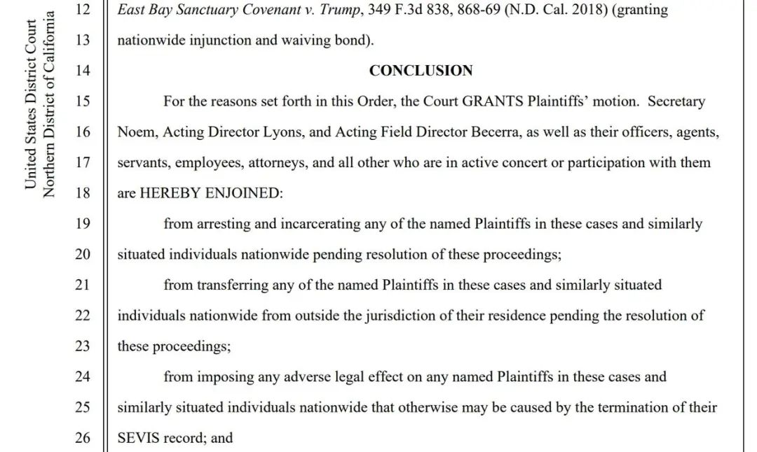 美国奥克兰地区法官Jeffrey White在周四的裁决中指出,政府不得在未进行个别审查、且未遵循联邦法规所列标准的情况下,取消国际学生的合法身份。