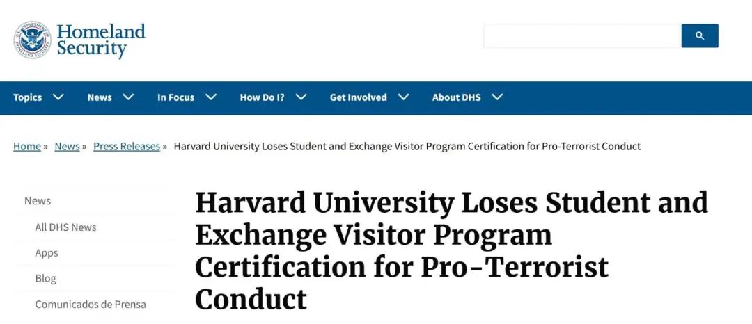 根据美国国土安全部官网声明,哈佛大学因为“支持恐怖主义行为”,被取消学生和交流访问者项目(SEVP)认证。声明表示,这意味着哈佛大学将无法再招收国际学生,同时现有国际学生必须转学,否则将失去合法身份。