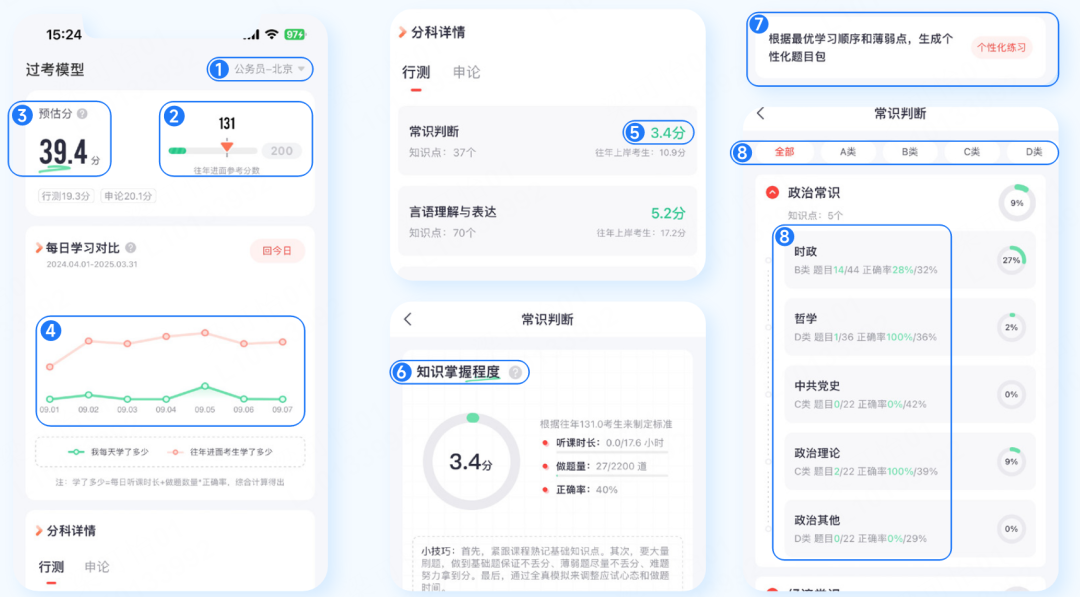 高途公考:高途公考以五大中心省会城市为核心辐射周边区域,线上线下产品组合进行全国公职考试的针对性覆盖;结合学员职业发展诉求,为学员定制体制就业规划;汇聚顶尖师资团队,构建线上线下多样化产品教学体系;全程配备二讲老师,通过智学过考系统动态监测学生进阶水平,实时调整教学复习节奏,全程督学答疑,全方面保障学员实现体制就业目标。