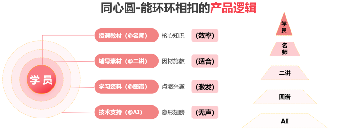 高途大学生业务构建了同心圆-能环环相扣的产品逻辑。名师打造授课教材,提炼核心知识,提升学习效率;二讲提供辅导素材,因材施教,适配学员差异;专业资料辅助学习,激发学习动力;AI 技术充当隐形助力,智能推送练习、帮助学员规划路径。在同心圆中,各要素以学员为核心,环环相扣,从知识传授到个性化服务,再到兴趣激发与技术赋能,全方位助力大学生成长。