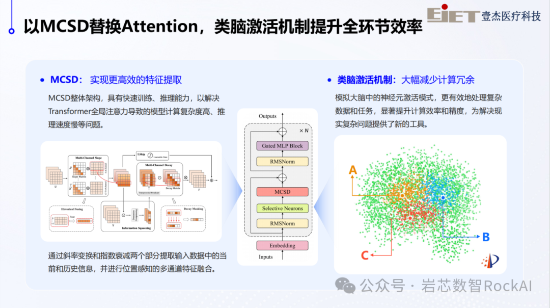 Yan架构大模型是RockAI自研的国内首个非Transformer架构、非Attention机制大模型,依托MCSD、类脑激活机制两大基础原理创新,模型性能显著提升。MCSD模块替换Attention机制实现更高效的特征提取,类脑激活机制模拟人脑的神经元激活模式,大幅减少计算冗余,降低算力消耗。