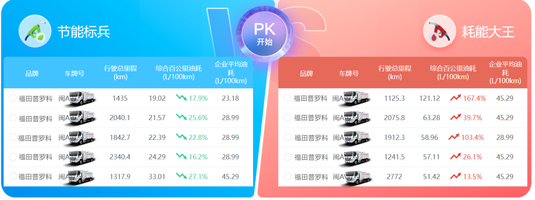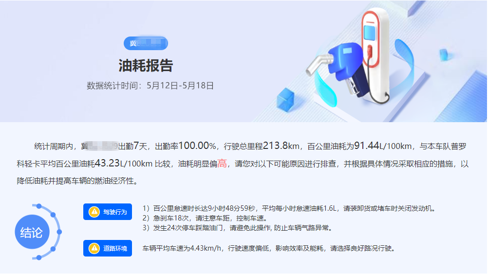 成本优化:通过运营评估发现油耗、电耗上升问题和原因,纠正急刹车、停车踩油门、长期怠速等驾驶行为,百公里油耗降低8%;避免高峰时段充电以降低电耗。