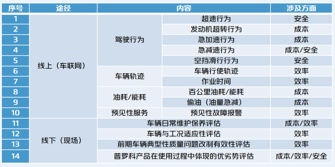 “线上+线下”双轨诊断:线上车联网系统,实时监控驾驶行为(超速、急加速/减速等)、车辆轨迹、油耗能耗及故障预警,精准识别运营漏洞。线下现场评估,从车辆保养、工况适配性到产品优势分析,提供定制化改进建议。