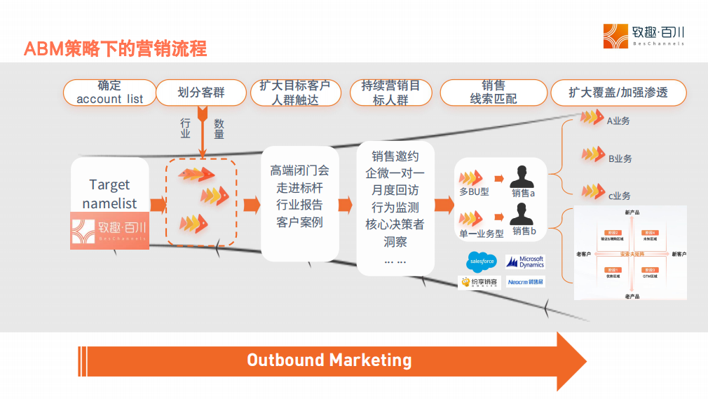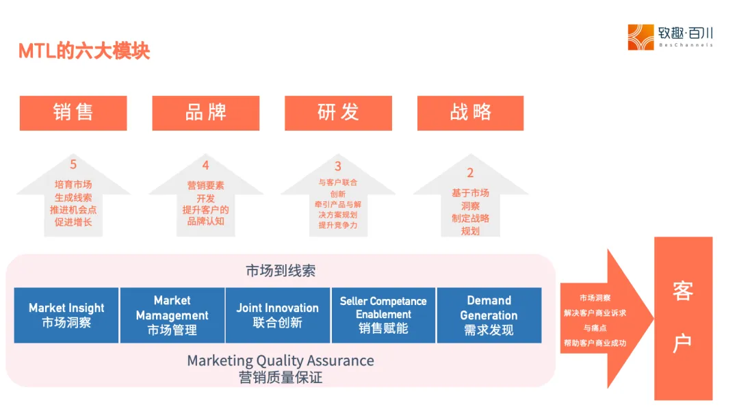 在 ABM 营销过程中,我们要的不是更多的线索,而是扩大单个企业的名单数量,以及扩大每个联系人的活跃度,这是 ABM 非常关键的特点。通过在存量用户中为不同的客户制定相应的个性化营销策略,通过高端闭门会、走进企业等一系列学习交流活动,来触达到客户的核心管理层。此外,通过 ABM 可以加强与销售团队的协同,依托每月统计的客户数据,分析客户在多个场景下的行为以及新增联系人,判断销售的客户覆盖率和线索是否会产生变化,进而对销售动作实现辅助,提升市场与销售整体的协同效率。但仅仅服务好存量用户是远远不够的,公司依然需要拓新,用户池需要不断地有新用户流进来。因此,公司需要一套灵活且稳健的营销体系营销体系来确保企业在拓新过程中的下限,并在此基础上尽可能提升转化 ROI。3.建立流程化市场营销体系MTL一个企业的基建是企业的组织能力和组织体系,MTL 流程的建立,可以确保一个企业的下限。MTL(Market