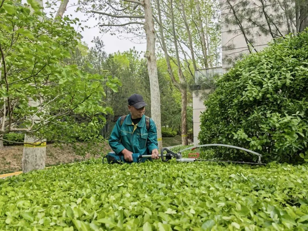 绿化师傅修剪园林,并为业主栽种玉兰树