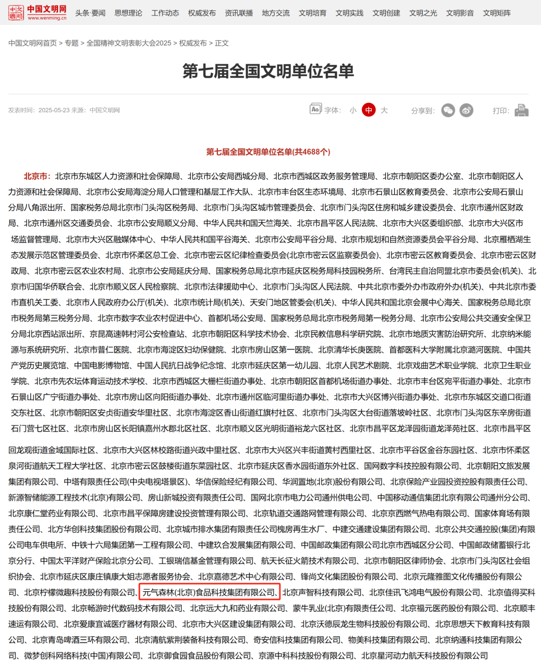 5 月 23 日,全国精神文明建设表彰大会在北京隆重召开,在此次大会上,元气森林凭借在企业文化建设、社会责任履行、创新发展实践等多方面的卓越表现,荣获第七届 “全国文明单位” 称号,成为全国范围内践行精神文明建设的标杆企业,此次表彰是对元气森林过往努力的高度认可。