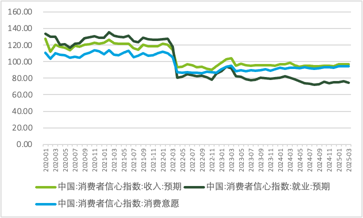 今年五一小长假延续了自疫情放开以来的高出游人次,客流运输需求同比显著提升。五一全社会跨区人员同比增长7.9%,水路、民航和铁路出行增速居前,自驾热度不减。五一国内出游人次和出游总花费同比提升6.4%和8.0%,分别恢复至19年同期的161.0%和153.1%,中外人员出入境则同比提升28.7%。在出行人次和意愿高涨的背后,客单价的下行仍然揭露出居民消费层级下降的现状。根据文旅部公布的数据估算,人均旅游花费仅为19年同期的95.1%,居民消费层级仍有待改善。从消费者信心指数来看,截至2025年3月,消费者对就业预期仍然处于历史低位,持续牵制收入预期和消费意愿回升。