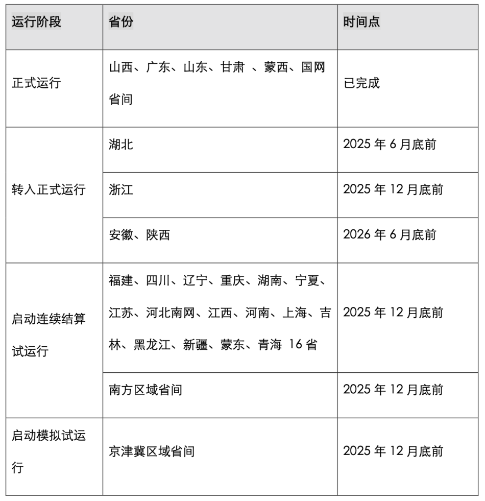 时间表更紧,市场覆盖面扩大。截至目前,全国34个省级行政区中,山西、广东、山东、甘肃、蒙西和国网省间市场已正式运行;更多省级现货市场将在2025年底前或2026年底前转入连续结算试运行或正式运行。